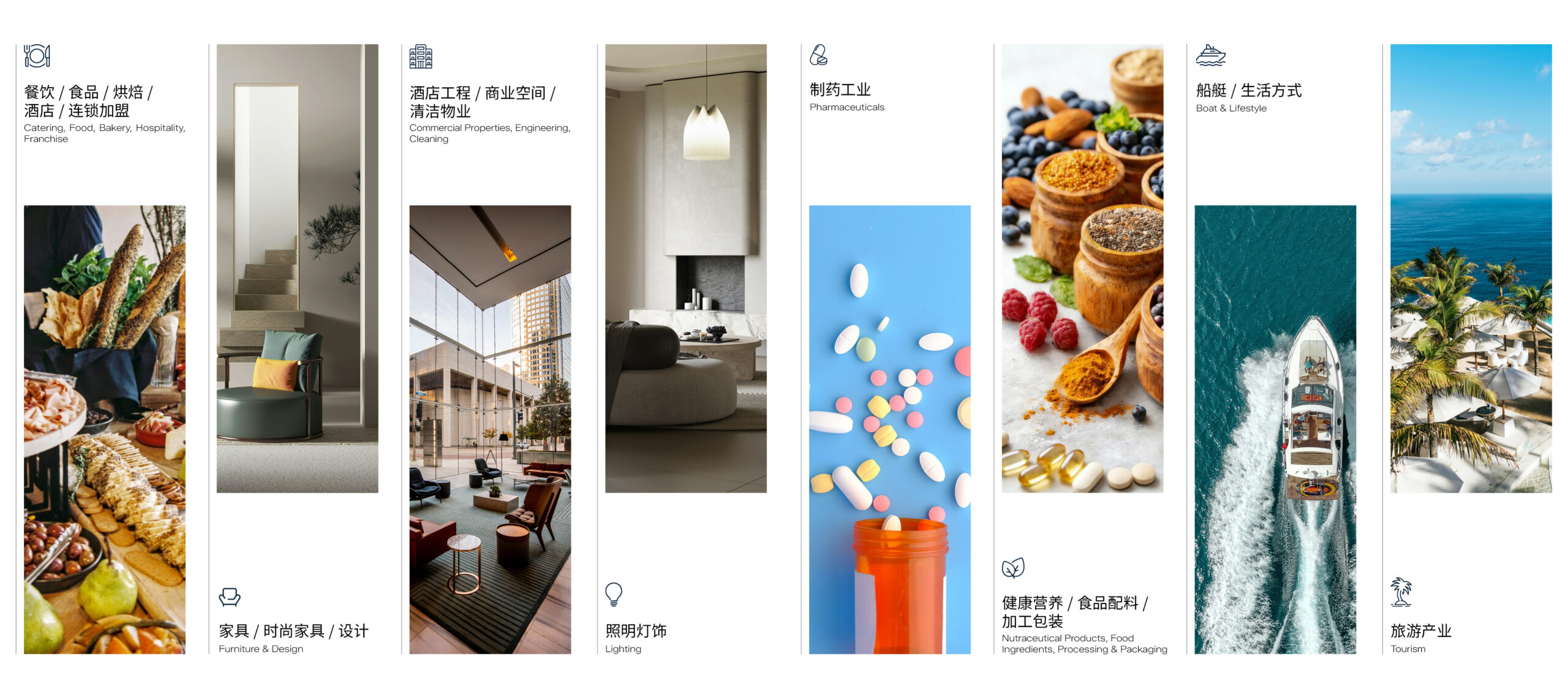 服务多个行业包括家具·时尚家居·设计、餐饮·食品·酒店、酒店工程·商业空间·清洁物业·照明灯饰、制药工业、健康营养·食品配料·加工包装、游艇·生活方式·旅游产业,线下展会全年共计70+场,遍及上海、广州、深圳、成都、郑州、中山等全国一二线城市及泰国、印尼、马来西亚等海外国家;同时设有VEC, DTS等线上展会平台,打造云端和实体展会双平台,促进贸易高效对接。